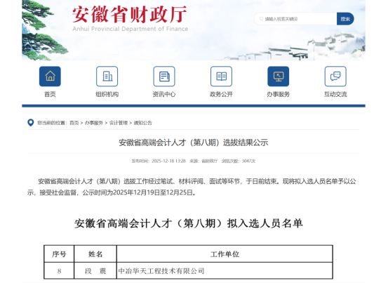 12月18日,安徽省財(cái)政廳公布“安徽省高端會(huì)計(jì)人才”(第八期)錄取人員名單,經(jīng)過(guò)材料評(píng)審、現(xiàn)場(chǎng)筆試、專家面試等多輪考核,中冶華天財(cái)務(wù)管理部員工段震從眾多候選人中脫穎而出、成功入選,有力展現(xiàn)了華天財(cái)務(wù)人員的綜合實(shí)力與向上風(fēng)采!